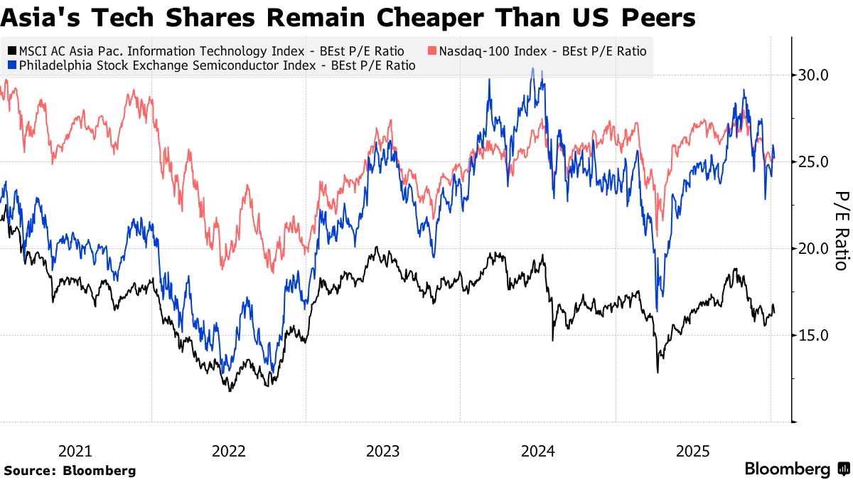 - Strategists at firms such as Goldman Sachs Group Inc. and Citigroup Inc. expect further gains, citing the importance of Asia’s tech stocks in the semiconductor supply chain and potential for earnings upside.