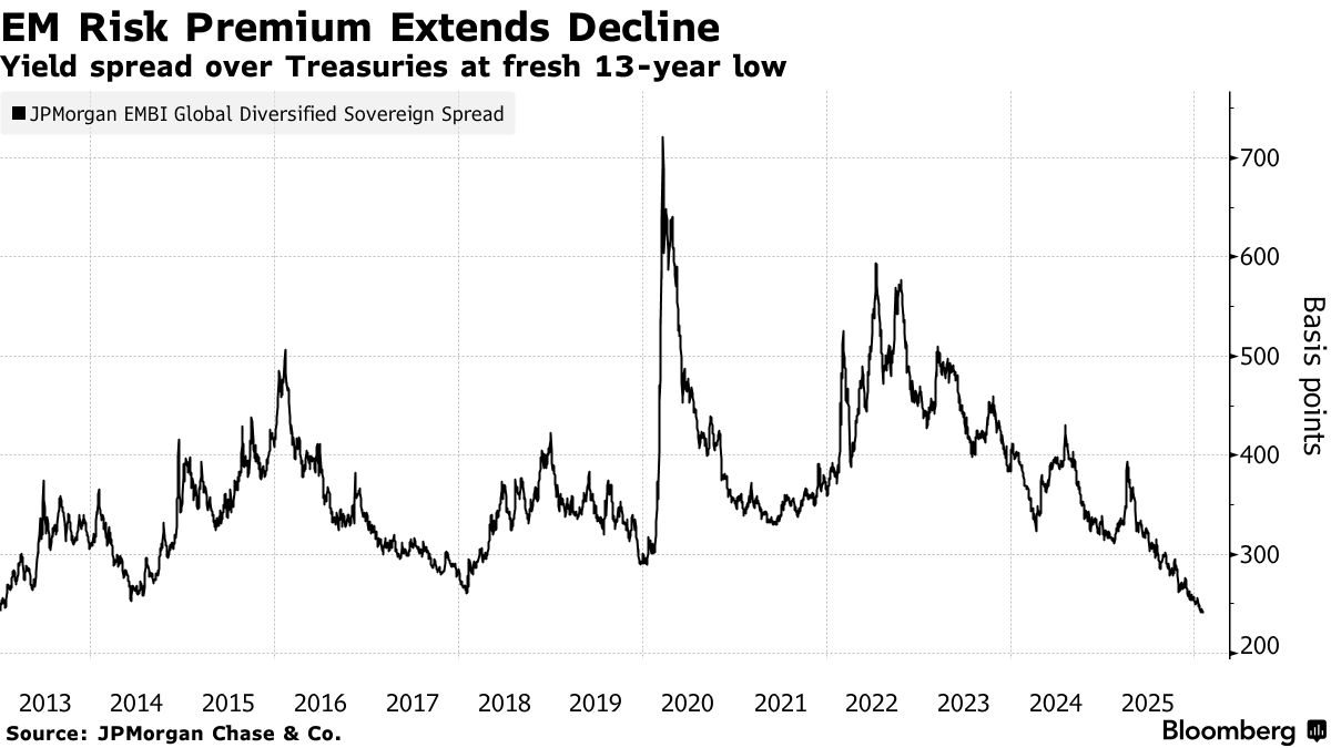 Investitori ora richiediamo solo 240 punti base, ovvero 2,4 punti percentuali, di rendimento aggiuntivo sui titoli obbligazionari dei mercati emergenti rispetto ai titoli del Tesoro, il livello più basso dal 2013.